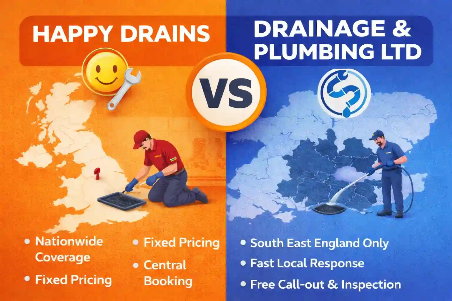 - Happy Drains operates nationwide but lacks local knowledge, while Drainage & Plumbing Ltd focuses on South East England, offering quick responses and familiarity with local drainage issues.